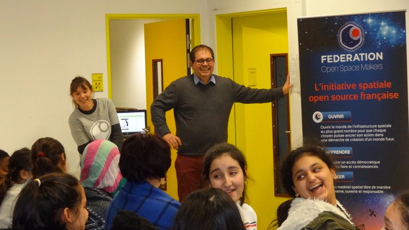 C'est vers 18h15 que la Fédération-mobile se gare dans le parking du collège. En descendent Fabio Mainolfi, qui représente le CNES, et Justyna Swat et Damien Hartmann, qui représentent l'assocation Open Space Makers.